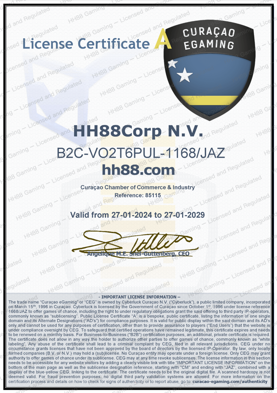HH88娛樂城持有馬耳他博彩管理局(MGA - Malta Gaming Authority)的官方認證,確保其運營符合嚴格的法律和監管標準。這意味著玩家的權益受到保障,並且平台必須遵守嚴格的運營規範。